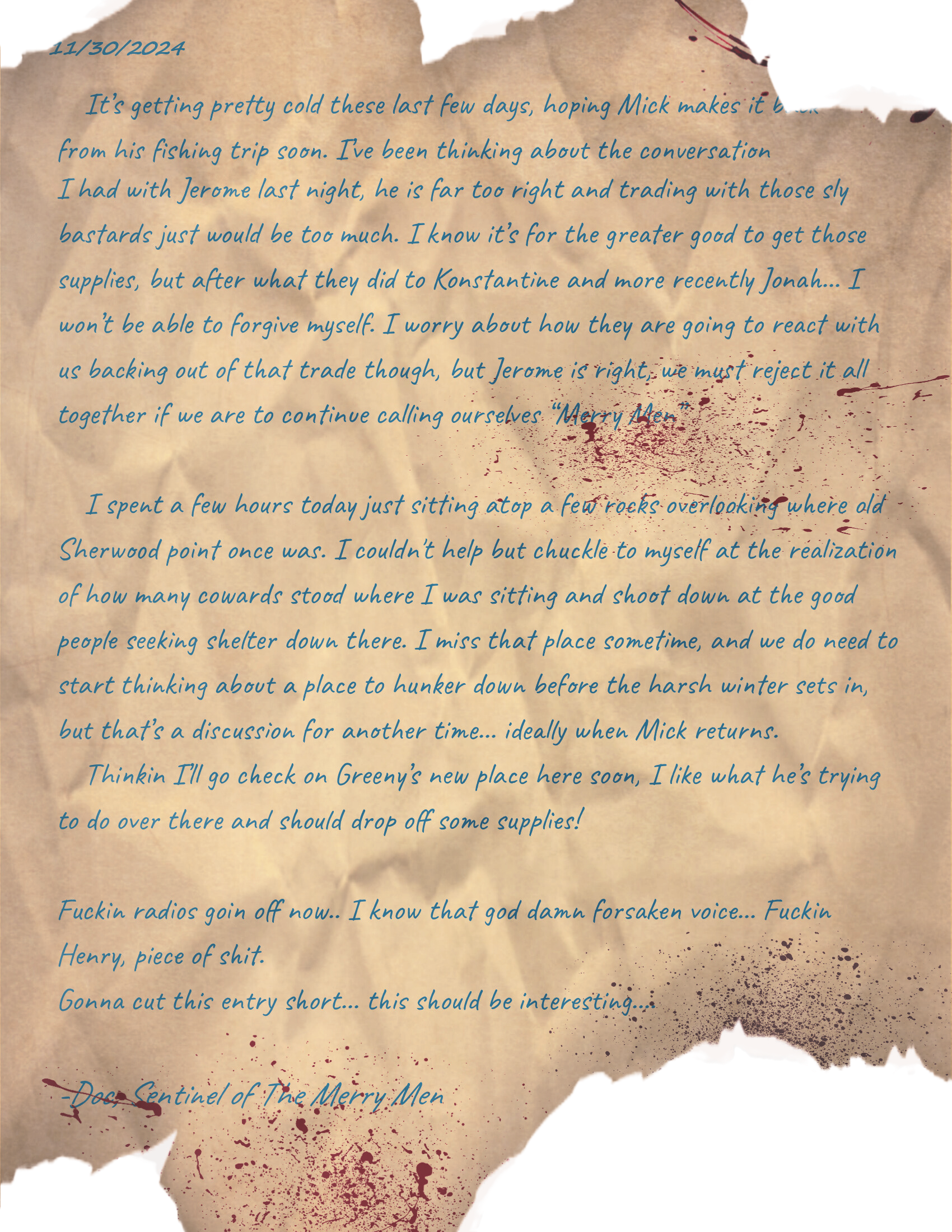 Much later Trev and I had arrived late to a wedding for Matt from the Overlook and Sierra, a self-proclaimed witch. Regi and Dill had attended the ceremony and we met up with them at the celebration afterward. It was intriguing observing members of the Merry Men, Chefs, and others we’d had meetings with in the past. Everyone seemed in a joyous mood and it brought back old memories of living in the East and visiting the Overlook. I watched as Regi and Dill bristled at the opportunity to speak with so many, their spirits seemed lifted, happy even, I longed for home; a calling to leave gnawing at the edges of my mind. A similar look was reflected in Trev’s eyes with stares westward. Regi and Dill had spent a good while speaking with members of the Fireflies, one in particular. Shortly after arriving home, Regi sequestered himself away entirely and would not venture out even for supplies; while strange, I chalked it up to still being riddled with guilt over Emerson as members of Odyssey had attended the ceremony and from what I was told it was not exactly a friendly acknowledgment.