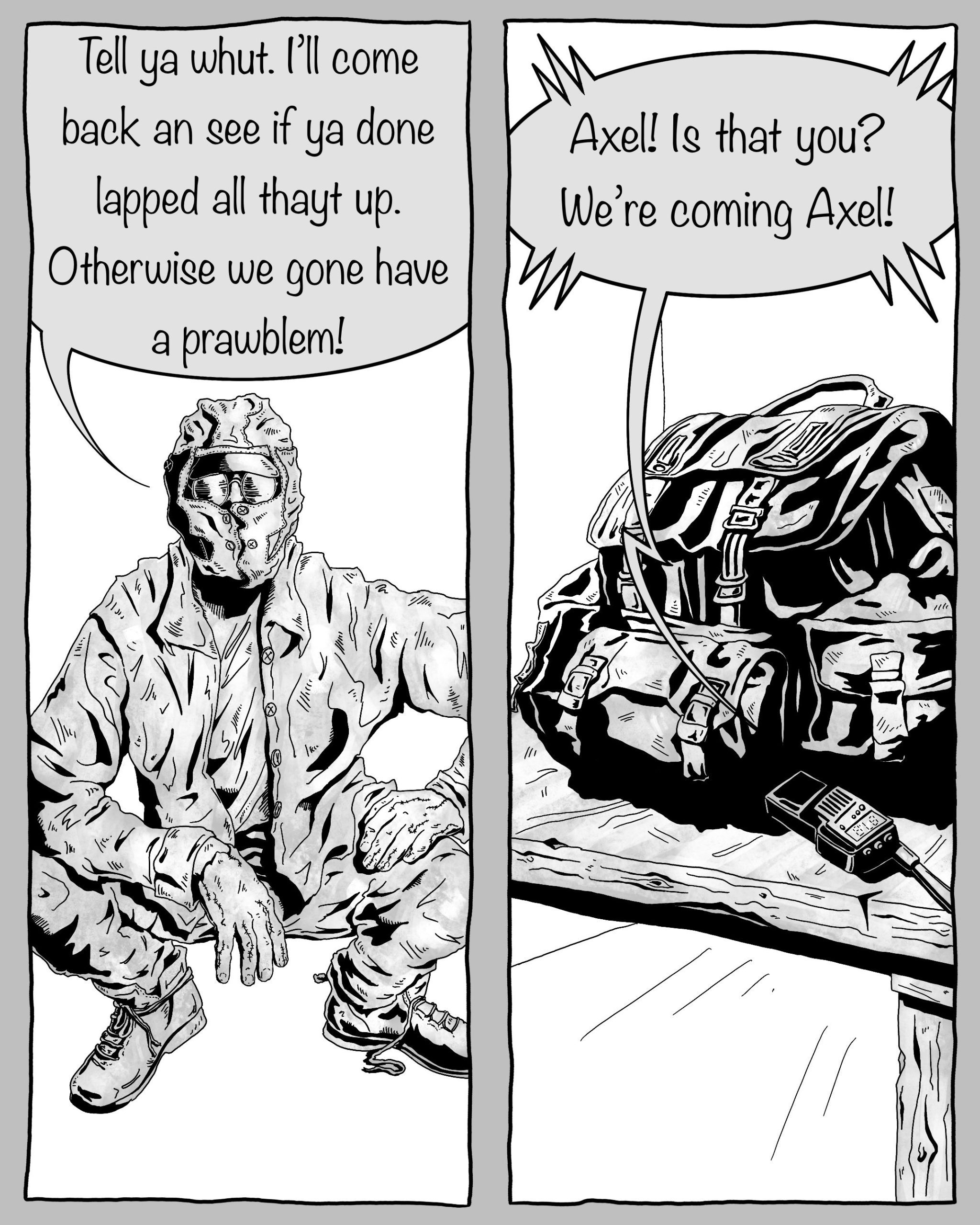 Dill, who was a neighbor in Zvir, had gone on several treks with Trev, Regi, and myself and was quickly proving her mettle, swiftly becoming a recruit. Upon returning from one such trek with Regi to the Spaces Motorcycle Club’s fight night, Dill had come back injured and alone. This was cause for concern, while Regi was prone to extended visits with groups we had relations with, he would generally keep us informed ahead of time if he were not going to be back for a time. Once Dill had recovered, we promoted her up to full recruit status as she’d demonstrated consistent grit and resourcefulness without question. We ranged north in pursuit of clues and it was within the vicinity of the ORCC compound where we managed to pickup a partial radio call for help from Regi; claiming that Odyssey, Vadim, Damien, and others had captured him in an attempt to “cure” him of this alleged gas sickness. He had suffered injuries, been injected with who knows what, and was effectively being forced to reside in the quasi-state of Brixton.