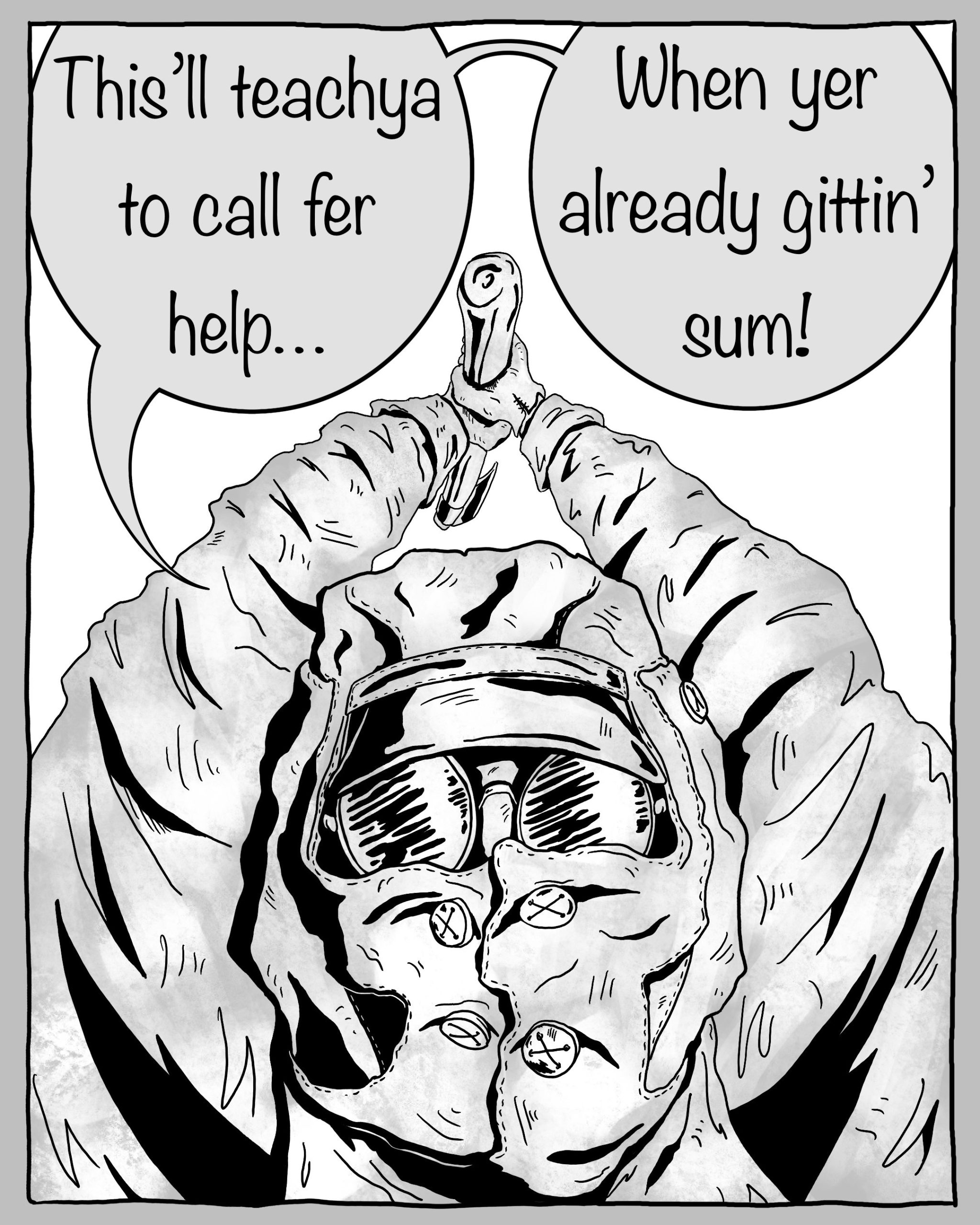 I still cannot shake the apathy that soon seeped its way into my mind, though. A dull feeling of listlessness took over my body. The constant buzzing I had felt before, that I’d come to believe was particles of the gas working their way through my circulatory system, bouncing off blood cells, giving me energy; that was all gone. You’d think the quiet would have been welcome, but it only made me feel more alone. The warm glow I had felt and seen emanating from…it’s gone now.